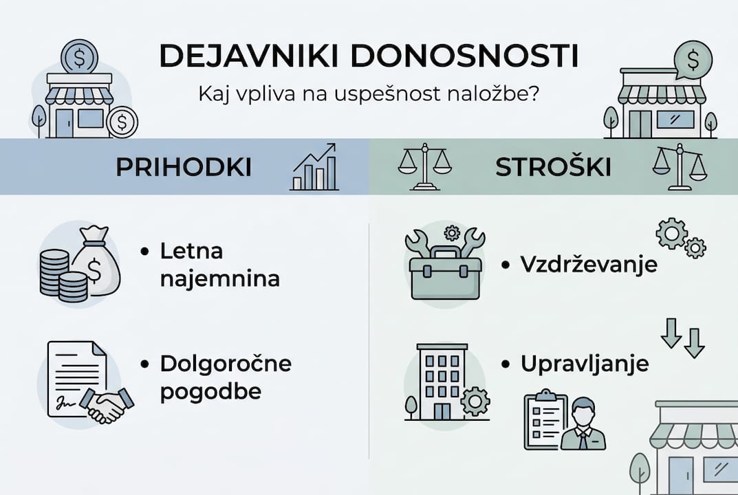Najemni prihodki so temelj donosnosti, vendar niso edini dejavnik. Operativni stroški, vzdrževanje, davki in morebitne prenove pomembno vplivajo na neto donosnost. Razlika med bruto in neto donosnostjo je lahko znatna, zato je pomembno upoštevati vse stroške.