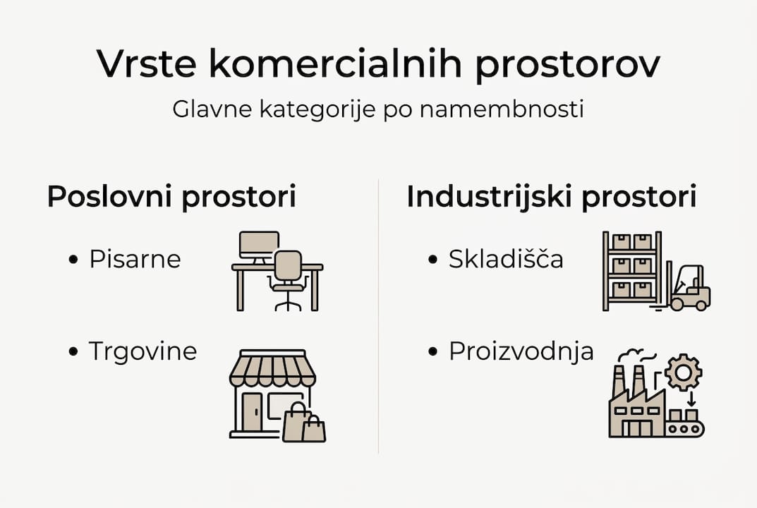 Ko razumemo osnovno definicijo, si poglejmo, katere vrste komercialnih prostorov v Sloveniji sploh obstajajo in kako se med seboj razlikujejo. Razlike niso samo v videzu ali velikosti, temveč v tehničnih zahtevah, pravnih omejitvah in poslovni logiki, ki stoji za vsakim tipom.