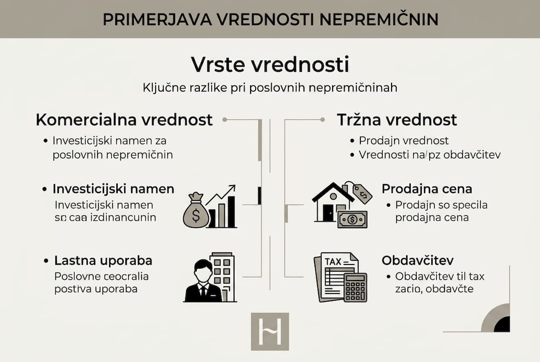 Zakaj je komercialna vrednost najpomembnejša za strateške odločitve? Ker edina neposredno odraža investicijsko logiko. Upošteva, koliko bo nepremičnina zaslužila, ne le, koliko je stala ali koliko davka boste plačali. Za razlike med vrednostmi in njihov vpliv na investicijske odločitve je koristno poznati tudi specifike posameznih segmentov trga.