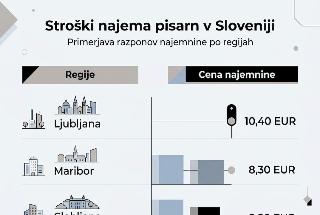 Cene najemnin se med slovenskimi regijami močno razlikujejo. Mediana najemnine pisarniških prostorov v Sloveniji je 10.4 EUR/m2/mesec, v Ljubljani 12 EUR/m2. To pomeni, da za 100 m2 v Ljubljani plačate približno 2000 EUR mesečno, medtem ko v Mariboru ali Celju lahko najdete primerljive prostore za 1200 do 1500 EUR.