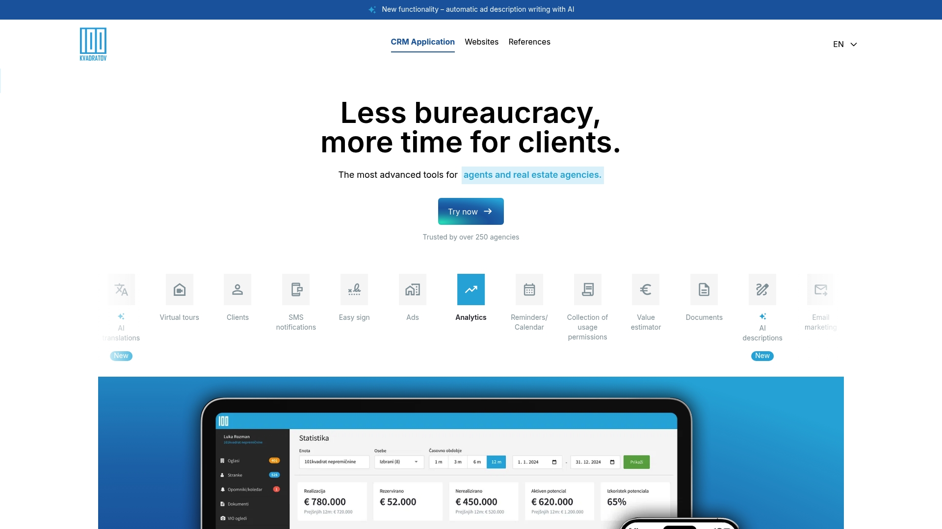 Agencija uporablja CRM 100kvadratov za hitro ustvarjanje oglasov z AI opisi, pošiljanje potrditvenih SMS sporočil, spremljanje odzivov z analitiko in hranjenje vseh pogodb digitalno. V praksi to skrajša čas od prvega stika do podpisane pogodbe in zmanjša papirno delo.