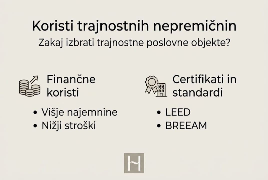 Trajnostne poslovne nepremičnine niso le modna beseda. Objekti z veljavnimi trajnostnimi certifikati dosegajo višje najemnine, se hitreje prodajo in imajo bistveno nižje obratovalne stroške, kar neposredno vpliva na donosnost vašega portfelja. Kljub temu ostaja pojem trajnosti za mnoge lastnike, podjetnike in vlagatelje v Sloveniji precej meglena stvar. Ali gre samo za sončne panele in recikliranje? Nikakor ne. Ta vodnik bo natančno razložil, kaj trajnost v poslovnih nepremičninah zares pomeni, kateri certifikati štejejo, katere finančne koristi so dokazane in kako konkretno optimizirati vaš portfelj.